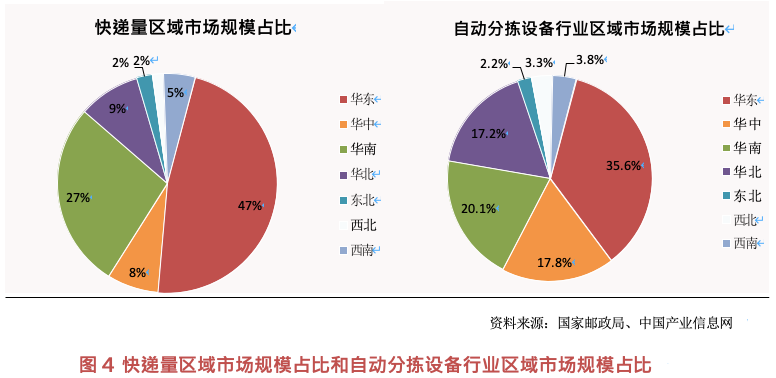 我國(guó)自動(dòng)分揀設(shè)備市場(chǎng)區(qū)域分布情況與電商快遞數(shù)量分布情況高度正相關(guān),以江浙滬為代表的華東區(qū)域及以廣東為代表的華南區(qū)域市場(chǎng)份額巨大,自動(dòng)分揀設(shè)備市場(chǎng)規(guī)模更大、技術(shù)發(fā)展更快,其中華東地區(qū)以超過(guò) 35%的市場(chǎng)份額位穩(wěn)居首位,區(qū)域市場(chǎng)規(guī)模效應(yīng)明顯。