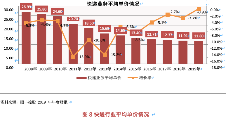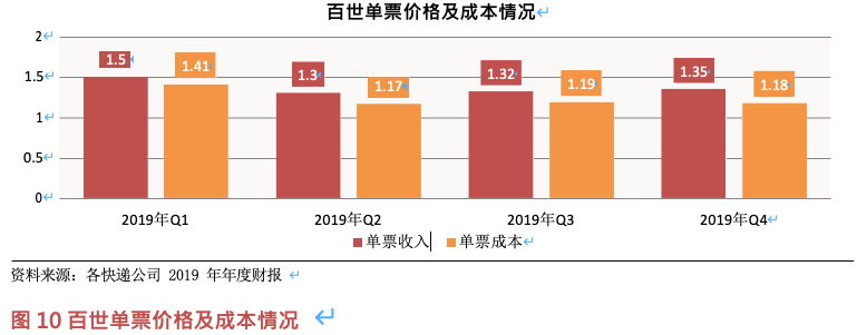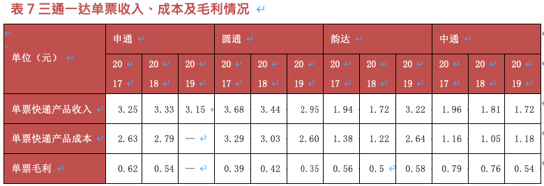 從快遞單票價(jià)格情況來(lái)看,順豐控股票均單價(jià)從 2018 年的 23.2 元降到 2019 年的 21.8 元, 降幅 6%。三通一達(dá)方面,申通、圓通、中通價(jià)格均實(shí)現(xiàn)下降,韻達(dá)同比增長(zhǎng),但利潤(rùn)方面保存平穩(wěn)。百世快遞同時(shí)受中低端快遞市場(chǎng)價(jià)格戰(zhàn)加劇影響,百世快遞單票收入由 1.53 元下滑至1.35 元,同比下降 11.76%,為通達(dá)系最低水平。單票毛利 0.17 元,毛利率 6.01%,同比增加0.66 個(gè)百分點(diǎn)。