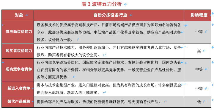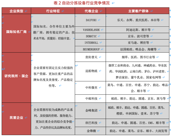 2019 年,我國(guó)自動(dòng)分揀設(shè)備行業(yè)競(jìng)爭(zhēng)態(tài)勢(shì)逐漸明朗,自動(dòng)分揀設(shè)備市場(chǎng)參與的企業(yè)主要可以分為三類:1、國(guó)際知名物流設(shè)備企業(yè);2、擁有研究院所、國(guó)企背景的物流設(shè)備企業(yè);3、具備技術(shù)實(shí)力的民營(yíng)企業(yè),此三類自動(dòng)分揀設(shè)備企業(yè)擁有不同的競(jìng)爭(zhēng)環(huán)境,各類企業(yè)根據(jù)競(jìng)爭(zhēng)環(huán)境制定了不同的營(yíng)銷(xiāo)策略、產(chǎn)品策略、服務(wù)策略等,具體情況如下: