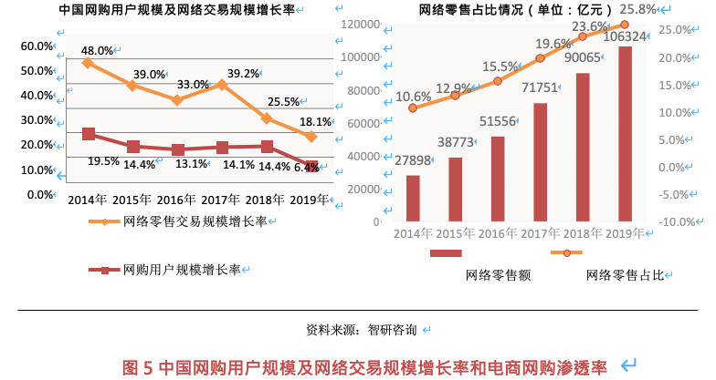 我國(guó)快遞與電商行業(yè)自 2012 年以來(lái),每年增速在 30%以上,但是隨著電商規(guī)?;鶖?shù)的不斷增長(zhǎng),其增長(zhǎng)率逐漸放緩。據(jù)推測(cè),未來(lái) 3 年快遞行業(yè)的增速將維持在 15%-20%的中高速增長(zhǎng)區(qū)間內(nèi),2019 年我國(guó)網(wǎng)購(gòu)用戶規(guī)模達(dá)到 6.49 億人,同比增長(zhǎng) 6.4%,較 2018 年增長(zhǎng)率降低 8 個(gè)百分點(diǎn);網(wǎng)絡(luò)零售交易規(guī)模達(dá)到了 10.63 萬(wàn)億元,同比增長(zhǎng) 18.1%,增長(zhǎng)率較 2018年下降 7.4 個(gè)百分點(diǎn)。從電商網(wǎng)購(gòu)滲透率來(lái)看,當(dāng)前實(shí)物商品網(wǎng)上交易額占社會(huì)零售總額的比重仍在不斷上升,2019 年達(dá)到了 25.8%,較 2018 年上升 2.2 個(gè)百分點(diǎn),但增速呈放緩態(tài)勢(shì)。